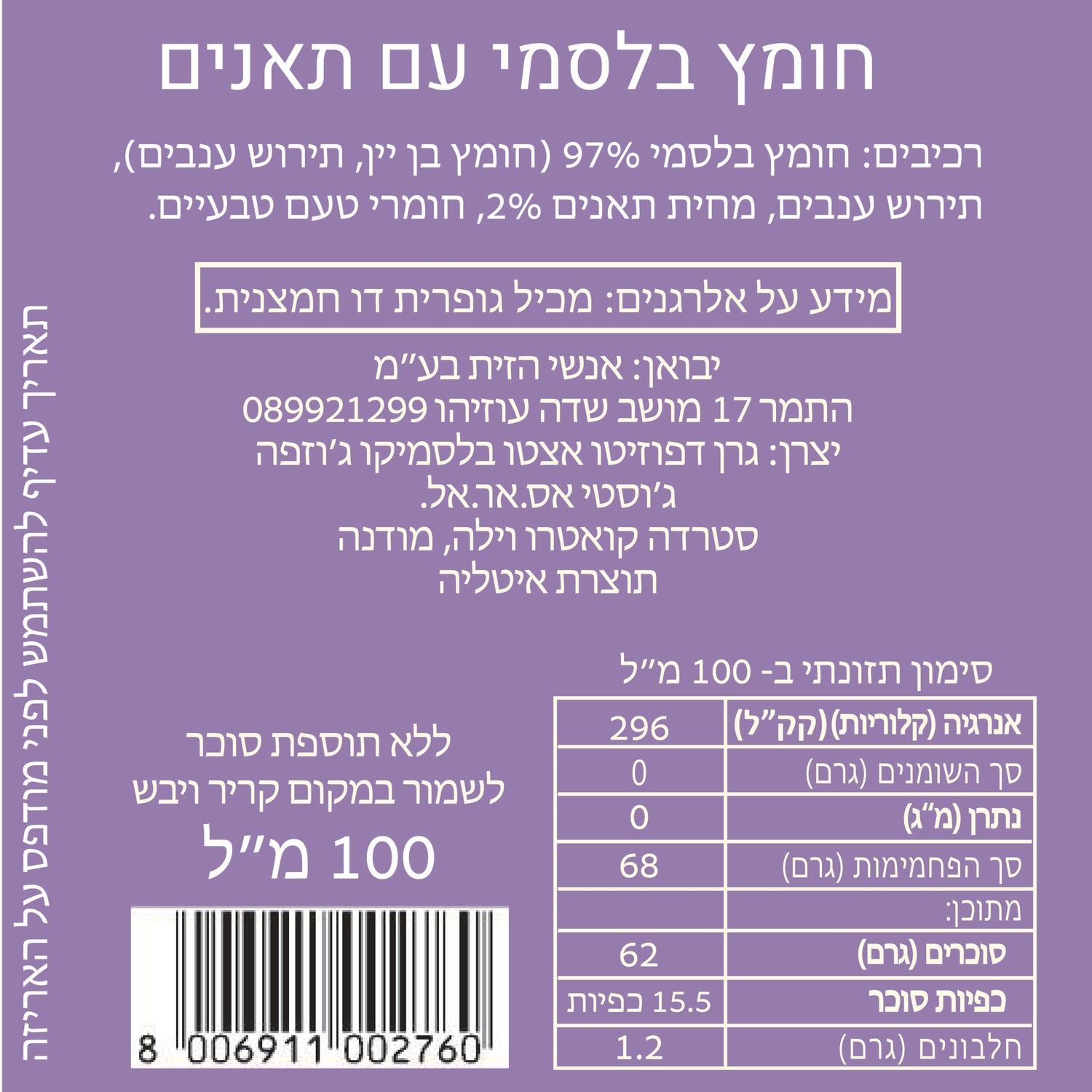 שלושה תיבולים חדשניים בעלי טעם נוכח של חומץ בלסמי שהתיישן 12 שנים לו הוסיפו תמצית כמהין טבעית, ומחית פטל ותאנים. מאוזן לחלוטין, רב תכליתי, עם מרקם סמיך וחלק. יישון של 12 שנים המוצר אינו כשר