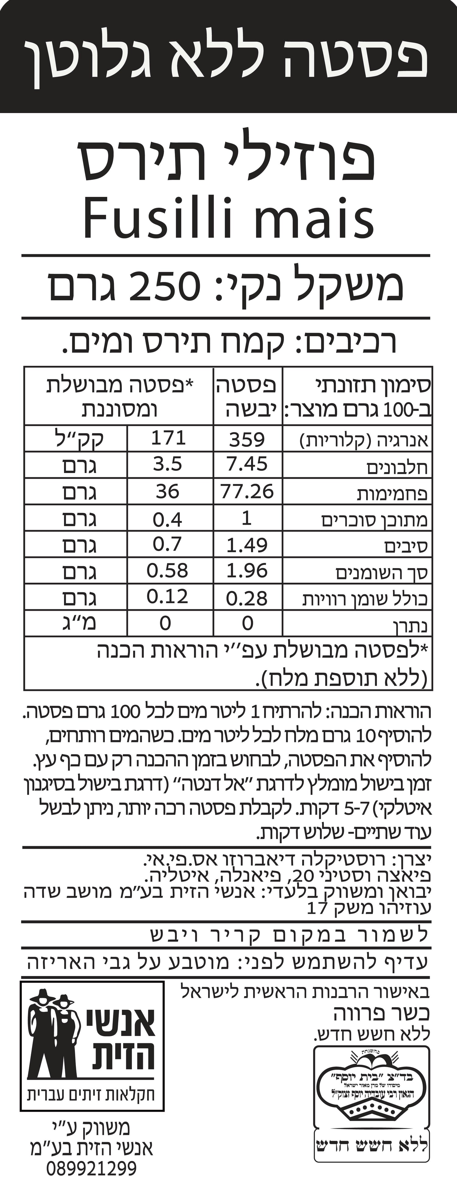 רוסטיקלה- פרי גלוטן פוזילי תירס 250 גרם