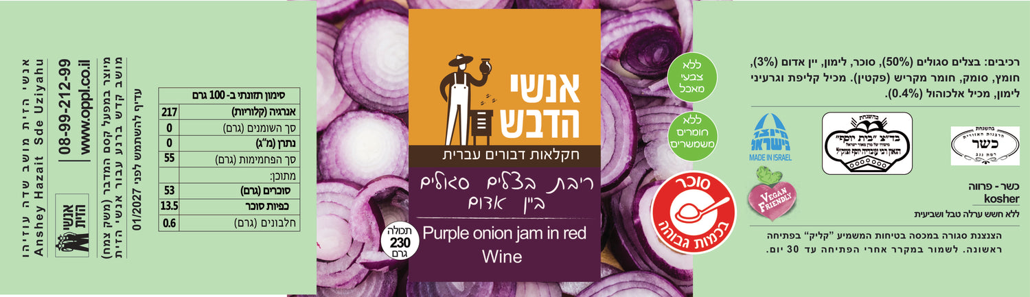 בצלים סגולים (50%), סוכר, לימון סחוט, יין אדום (3%), חומץ, סומק (0.7%), חומר מקריש (פקטין).